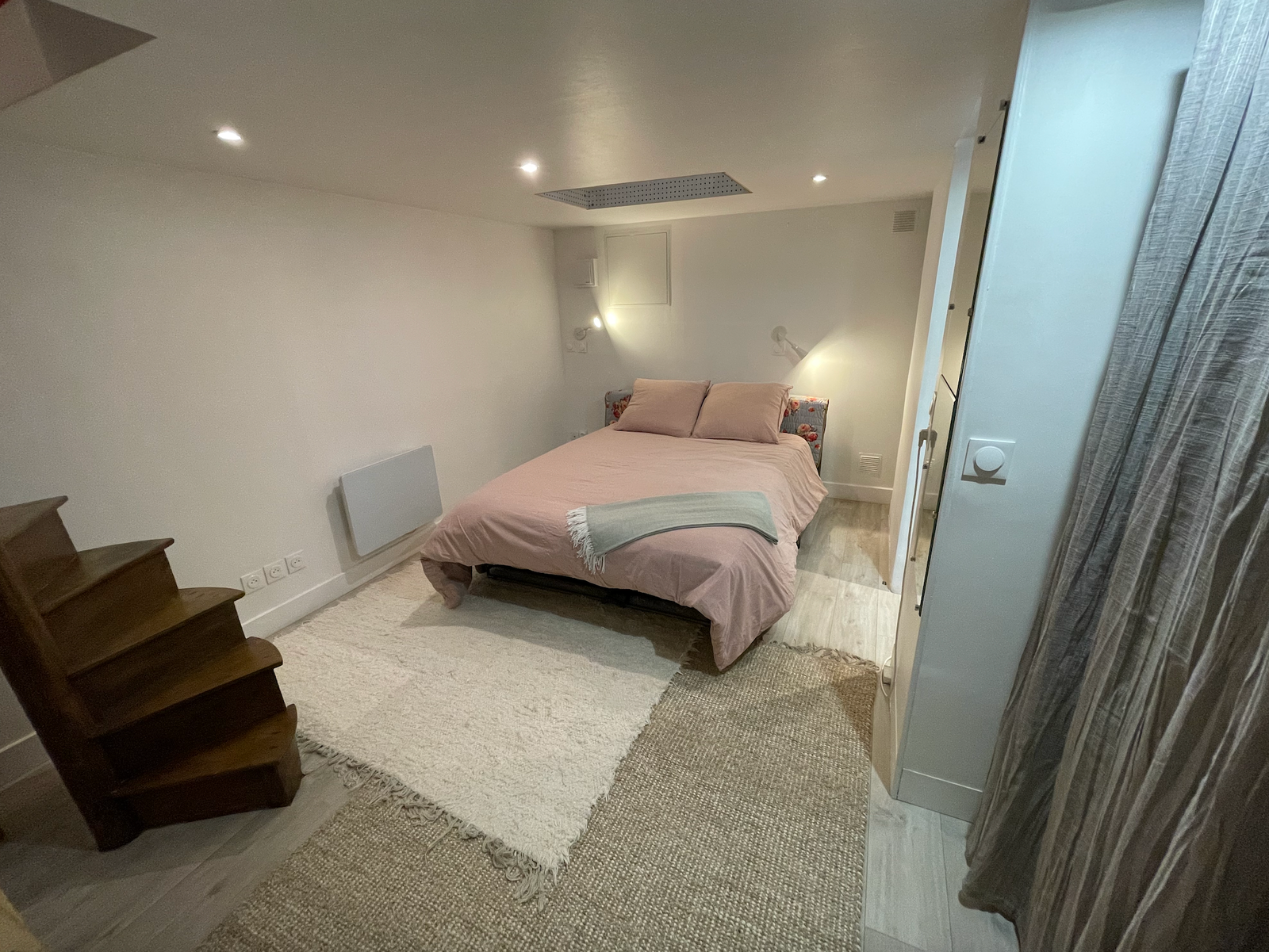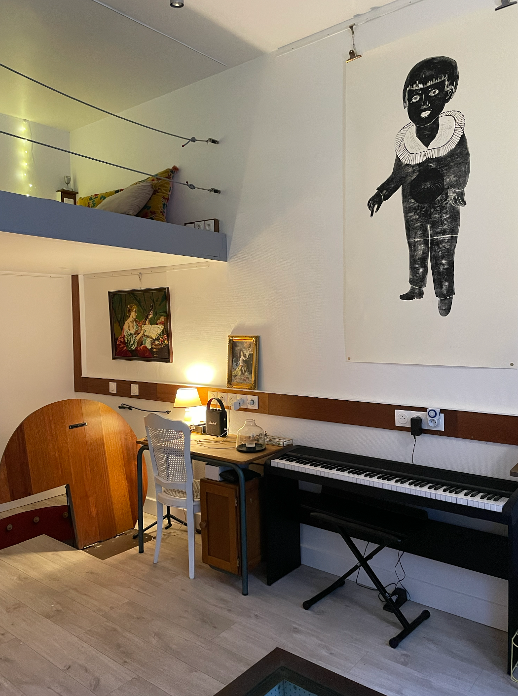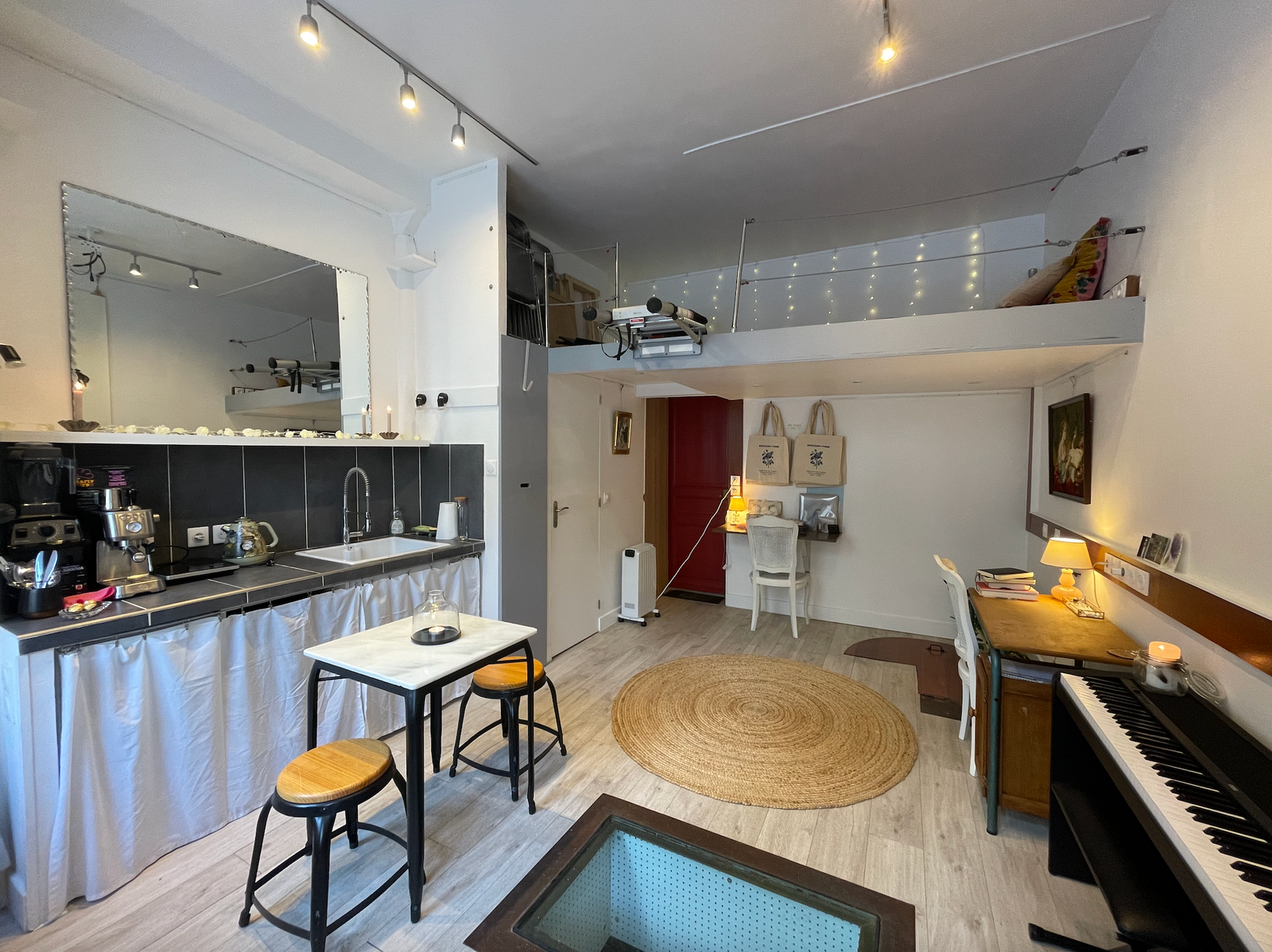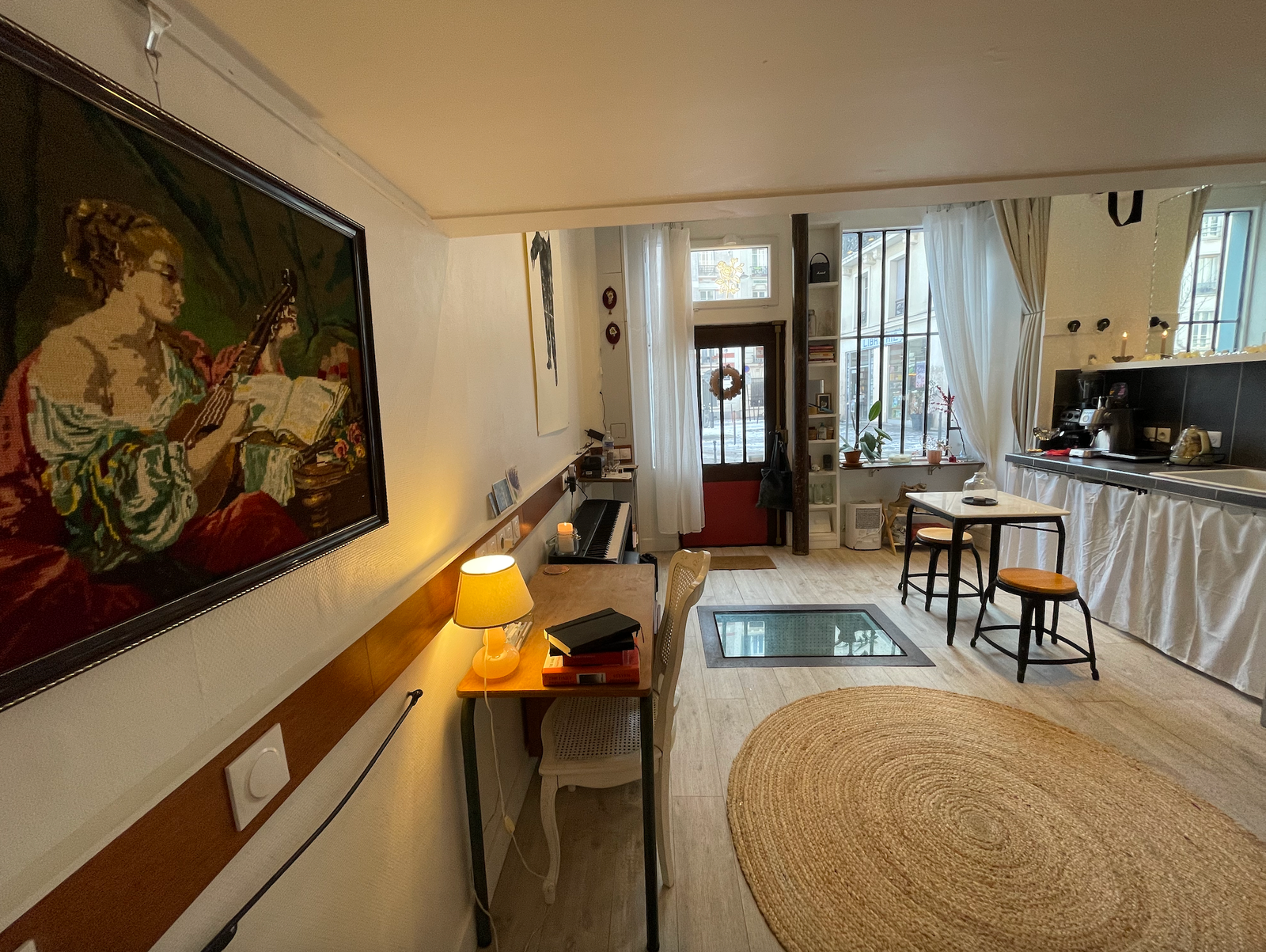 The atelier has its own private street entrance and is composed of a main studio floor, a cozy mezzanine/reading nook, and a souplex bedroom space below with a comfortable queen fold-out bed, closet, shower, sink, and additional work desk. Guests have access to the entire studio while staying, including the kitchenette (microwave, coffee machine, mini-fridge, kettle, and one induction hub for very basic cooking), two distinct workspaces, electric piano, projector for film nights, dimmable lighting, bluetooth speakers, and the creative energy of a lived-in art space. It is not a traditional apartment, but a warm, cozy, thoughtfully outfitted studio, perfect for artists, writers, thinkers, wanderers, and anyone who wants to feel like they truly live in Paris, even if only for a little while.